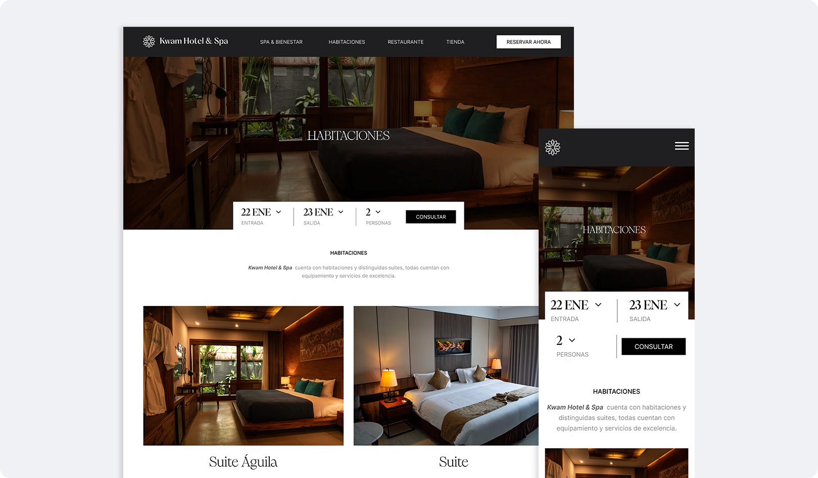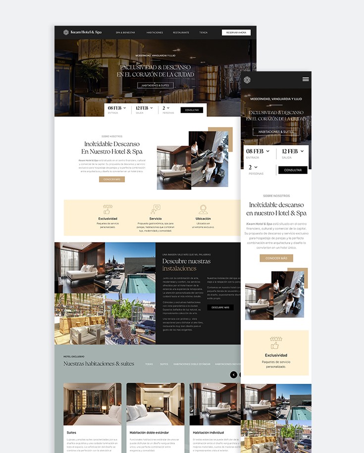 Página web para descubrir el hotel & spa Kwam, un espacio diseñado para ofrecer una experiencia de hospedaje única. Cada detalle ha sido cuidadosamente pensado para superar tus expectativas y crear recuerdos inolvidables.