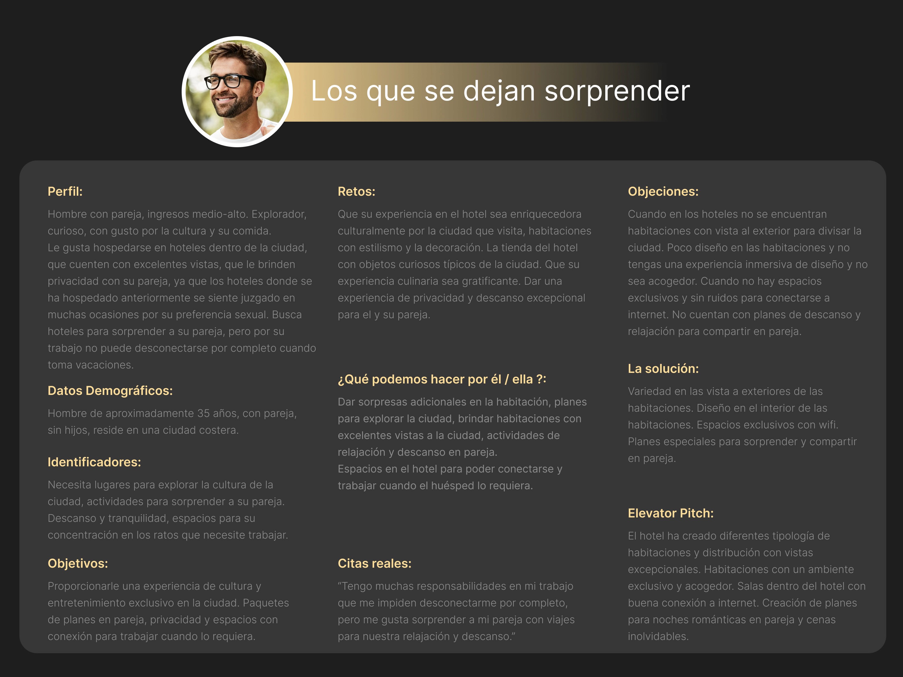 En una ocasión especial de aniversario de pareja, decide proponer a su pareja este nuevo lugar que él ha conocido a través de redes sociales, y del cual ha visto buenas reseñas en blogs de viajes.