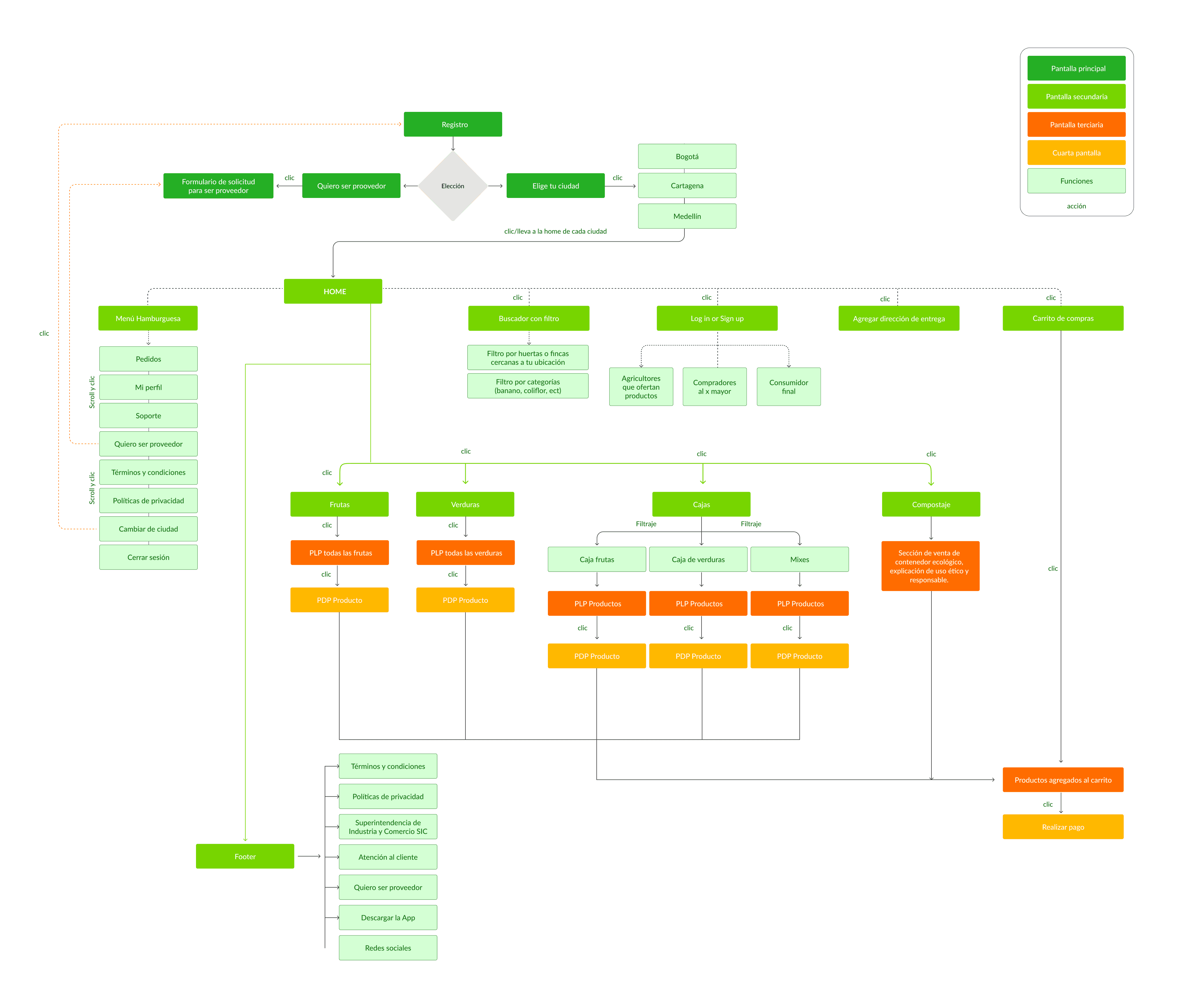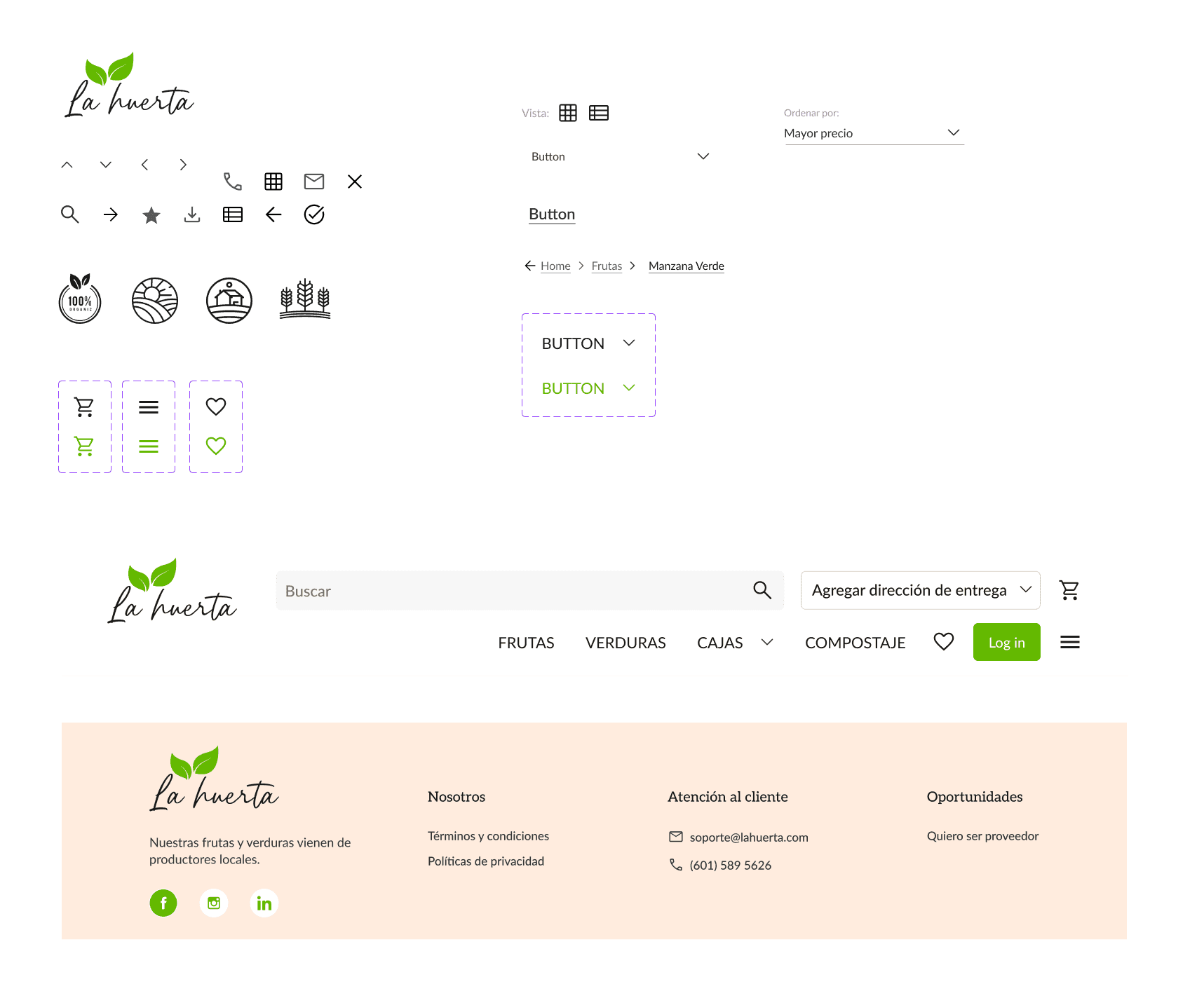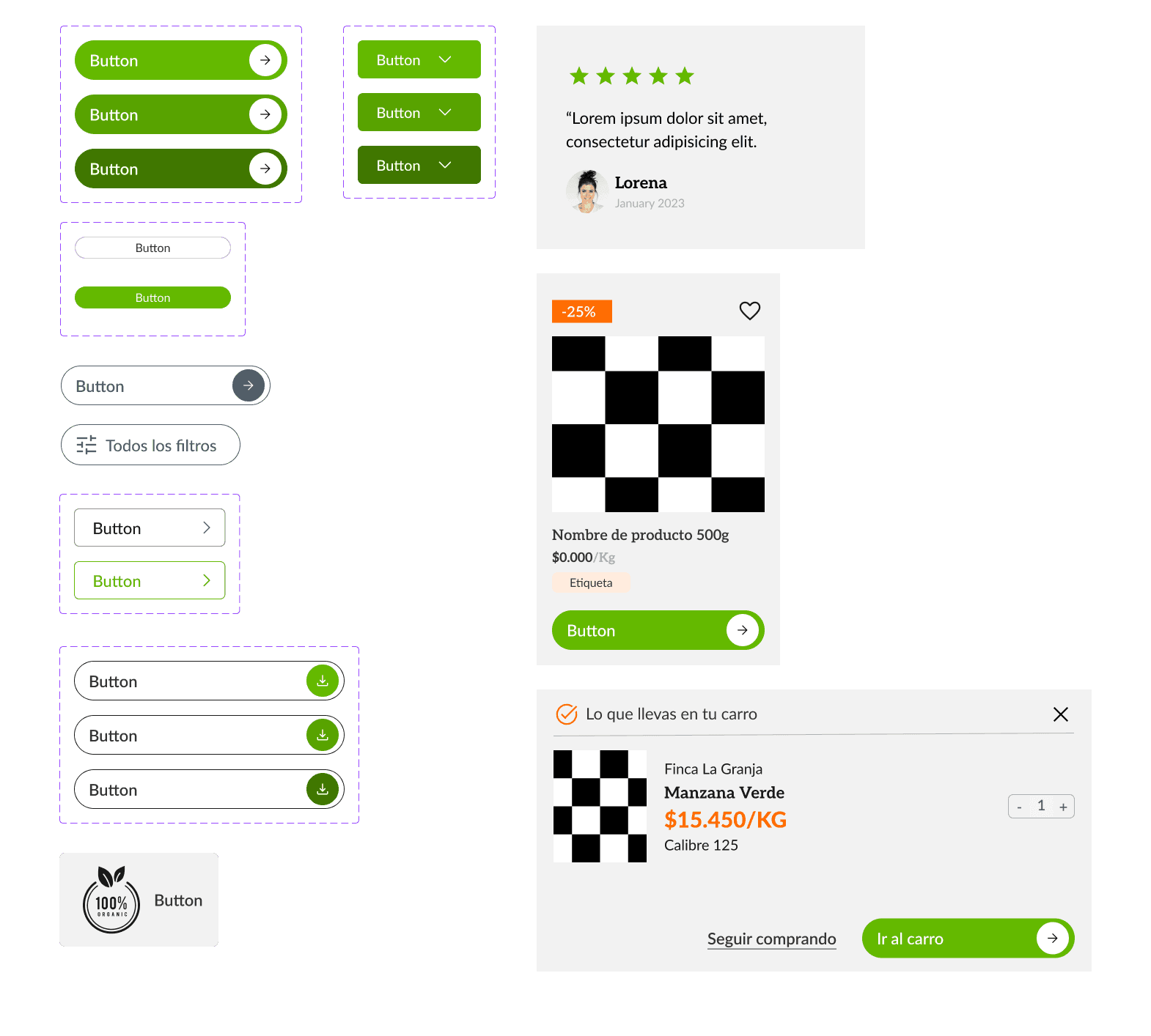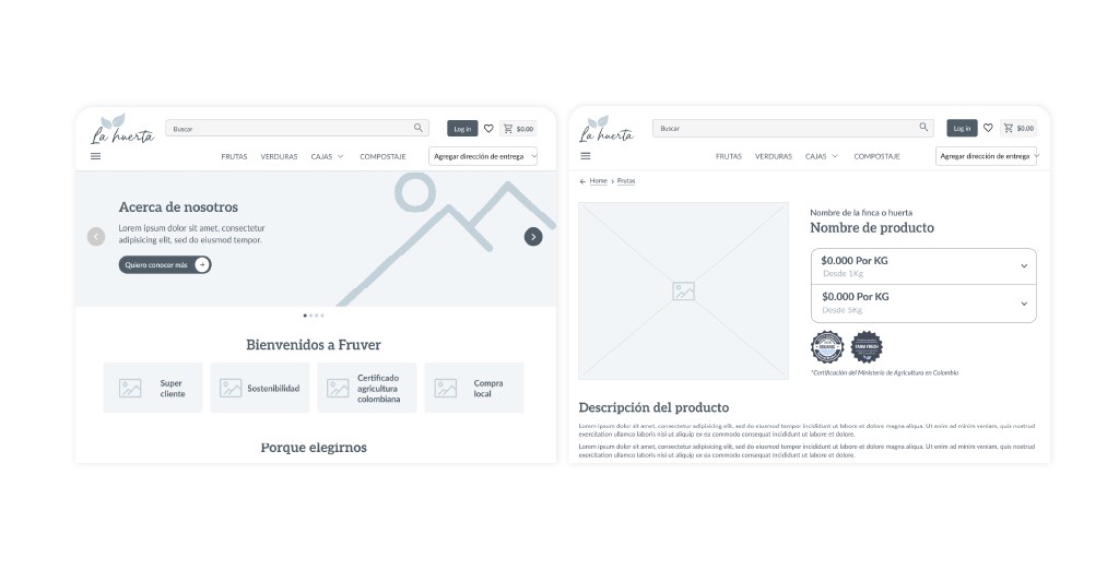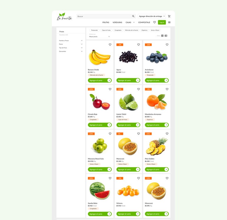 Adicionalmente, implementé un sistema de filtros para que los clientes pudieran seleccionar frutas y verduras según la huerta o finca de origen, el precio y el tipo de producto. En la página de producto (PDP), añadí un llamado a la acción (CTA) para descargar información detallada sobre el proceso de cultivo, reforzando la confianza en la calidad de los productos ofrecidos.
